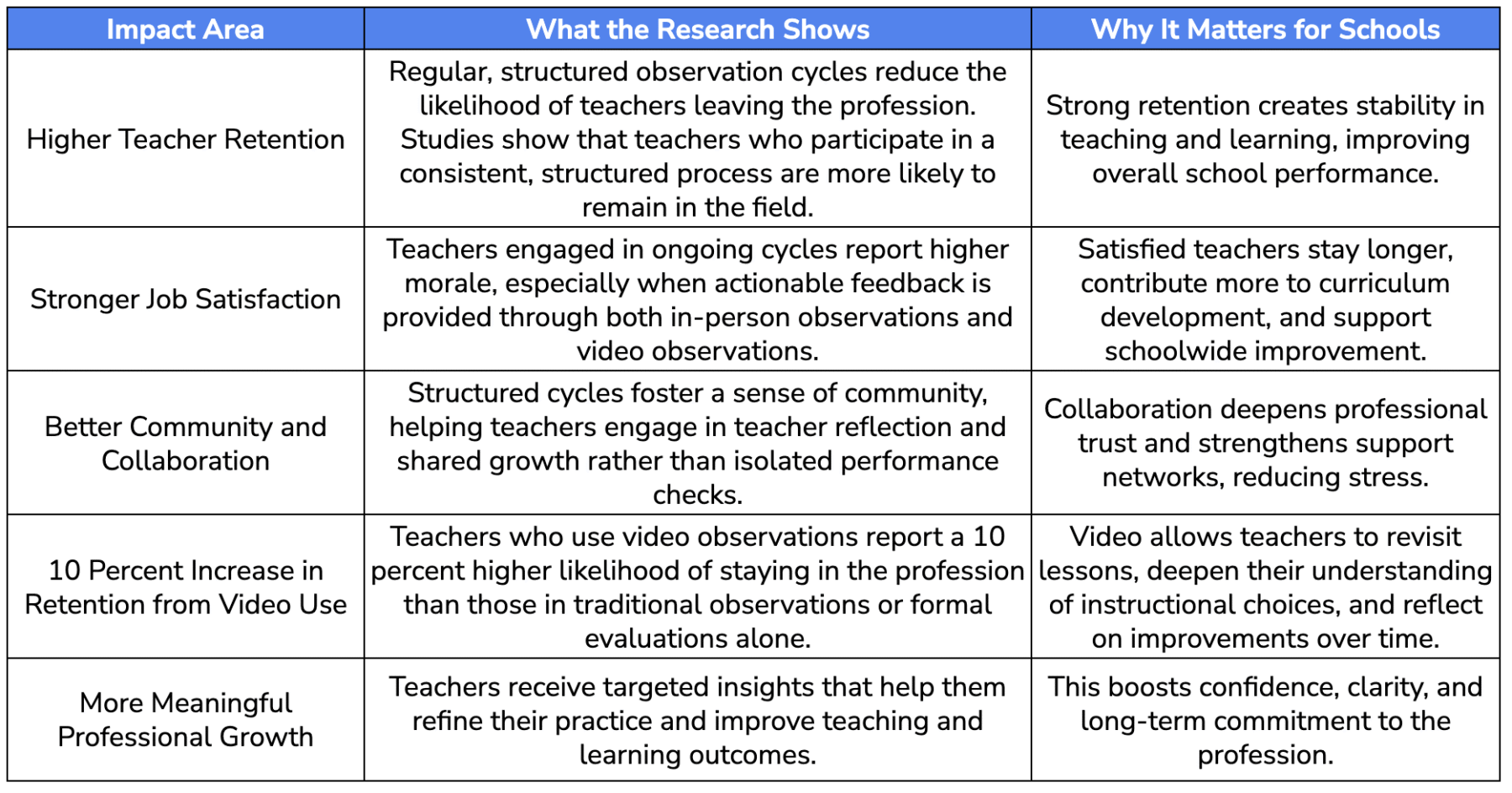 Structured observation cycles do more than refine instructional practice. They also play a major role in keeping teachers motivated, supported, and committed to their school community. Research shows that when observations are consistent, collaborative, and paired with meaningful reflection, teachers feel more confident and are more likely to stay in the profession. Below is a clear look at how structured cycles directly impact teacher retention.