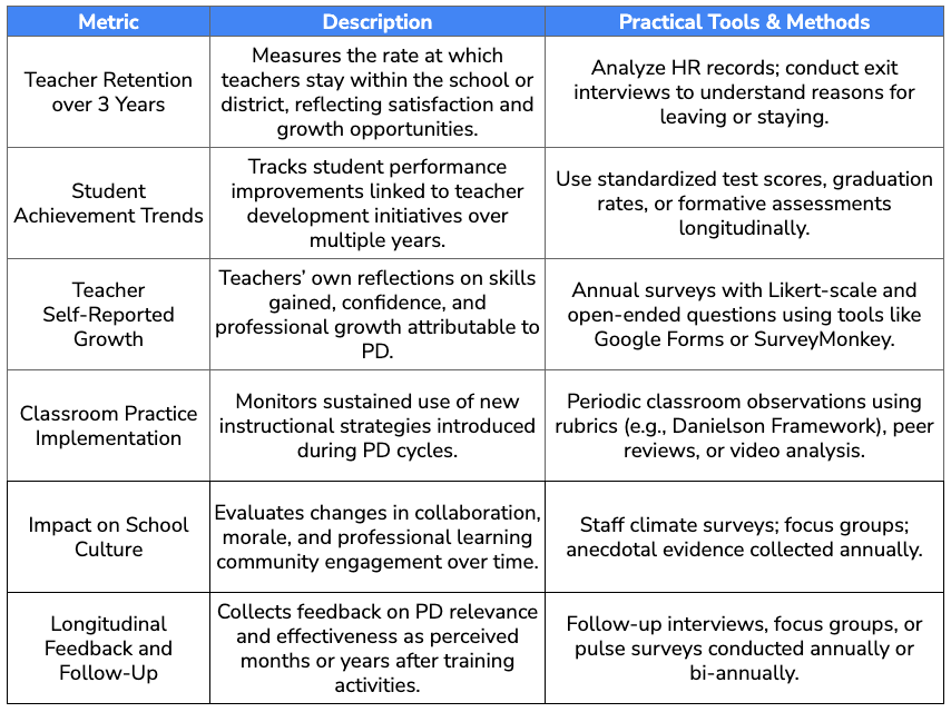 Here are key metrics and practical tools to measure the lasting impact of continuous professional learning: