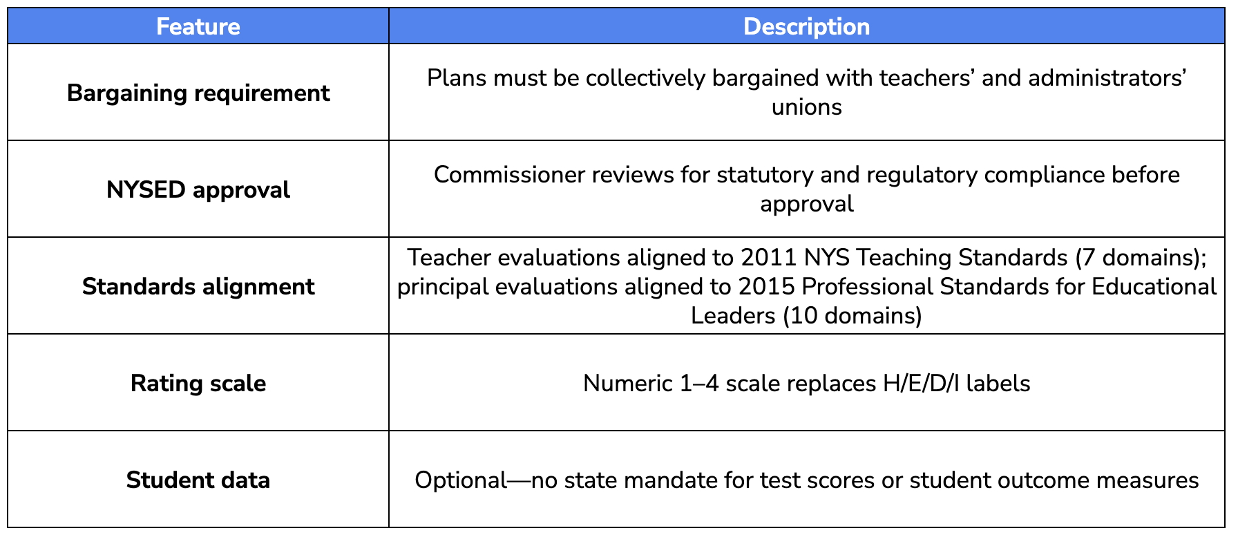 - STEPS removes state-mandated test-score requirements and shifts to a 1–4 numeric rating scale, with plans locally negotiated between districts and unions before State Education Department approval.