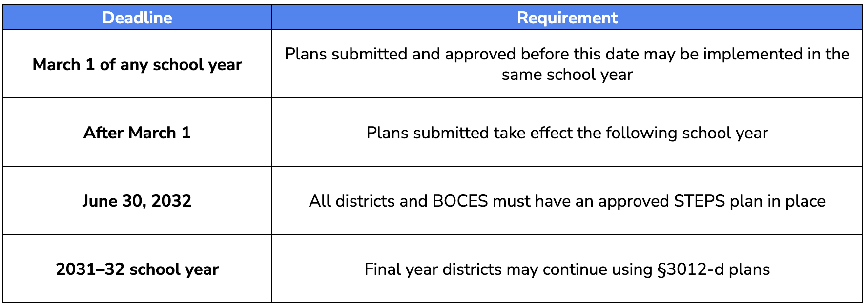 - School districts and BOCES can continue using §3012-d APPR plans through the 2031–32 school year, but must have a STEPS plan approved and in place no later than June 30, 2032.