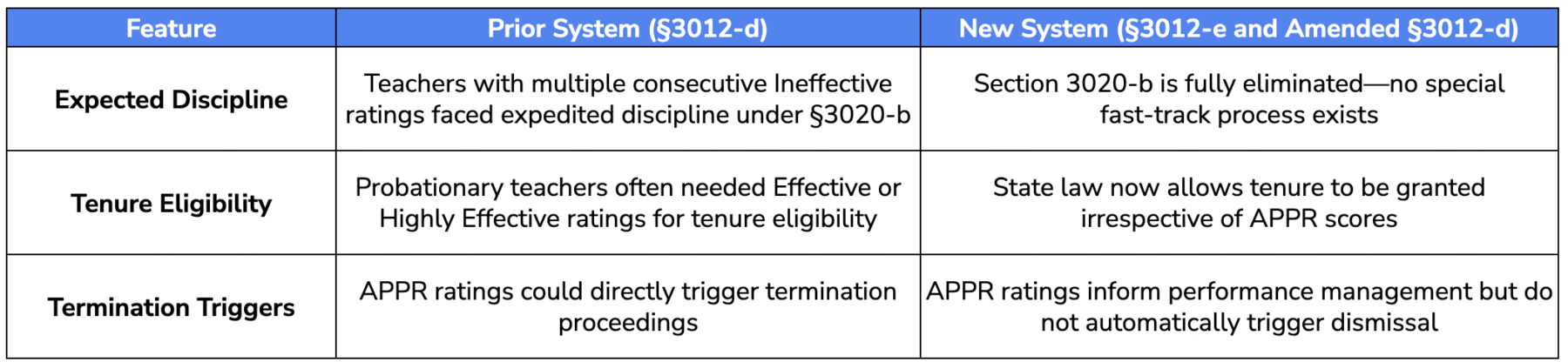 The 2024 reforms fundamentally changed the stakes attached to APPR ratings, particularly regarding tenure decisions and expedited discipline processes.