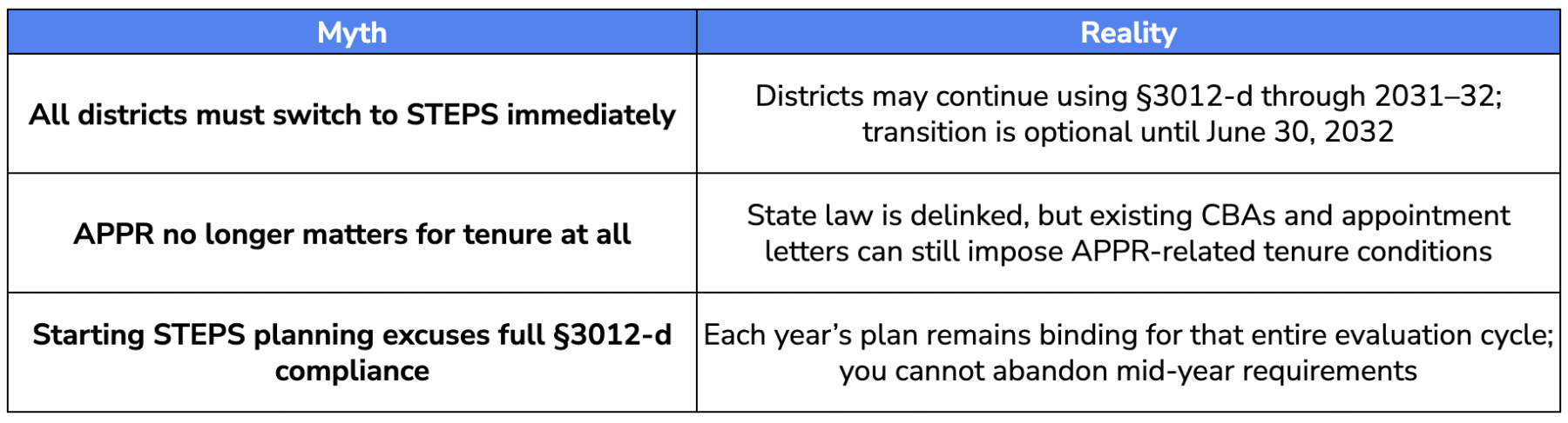 - CBA override complexity: The de-linkage of APPR from tenure is significant but not absolute. Many active contracts contain specific APPR-conditioned tenure language. Districts must audit all appointment letters to identify these binding provisions.